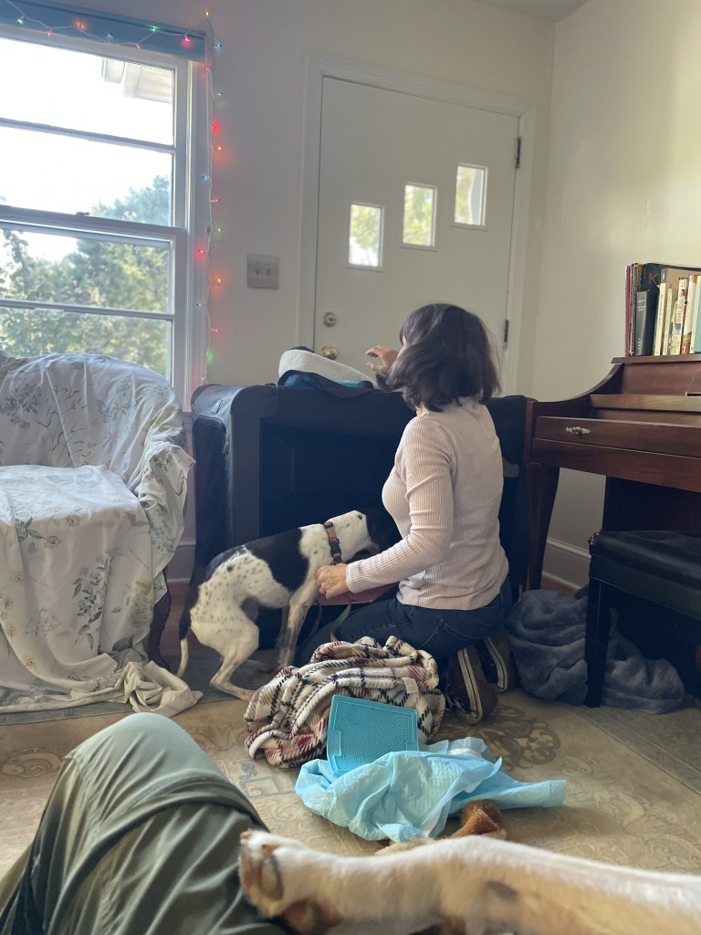 Today has been another frustrating day. There have been a lot of pee accidents. Even as a vet, I am not sure why. She has some control; I can tell that because she urinates when we take her outside. Does she just have impaired control, so that when she gets excited (like when we come home) she pees? Does she have a UTI (but that seems less likely as I’ve had her on antibiotics for several days because she and our other dog were both intermittently licking her incision and I was worried it was getting infected)? Or are we leaving her too long (but we are only leaving her 2-3 hours max)? She doesn’t let us know when she needs to go. She never learned to do that, since she has had a dog door and 24/7 access to outside ever since we’ve had her. We need a better system to deal with this.
