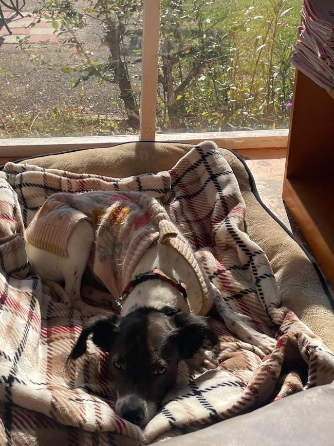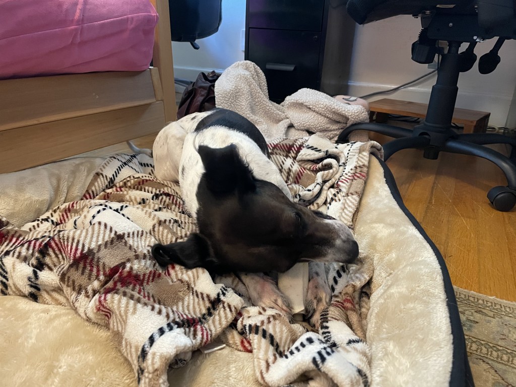 Some time out of the crate: she sits with me in this bed while I work at my computer. Our other dog is shut out of the room and Daphne’s access to all the furniture is blocked so she can’t jump up on anything and hurt herself. -
